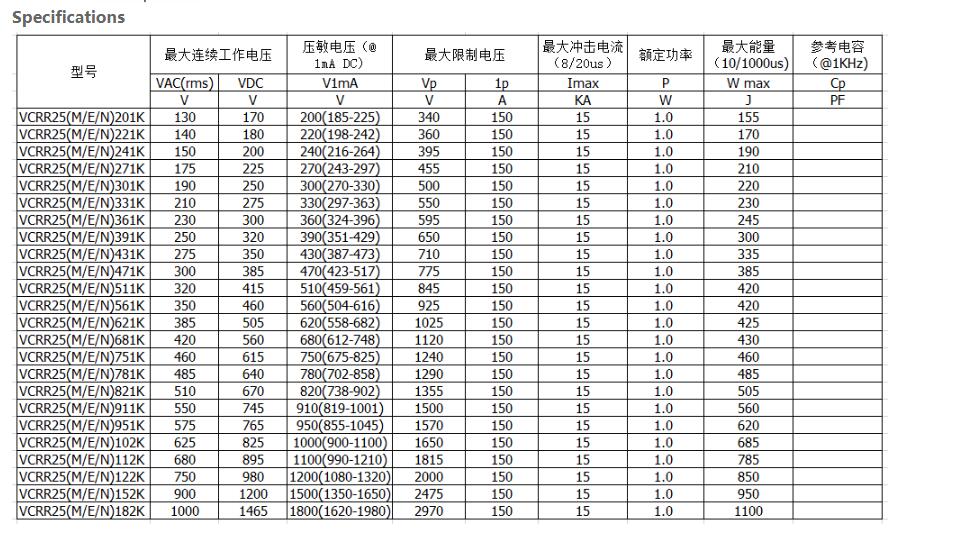 ?壓敏電壓范圍從(200V-1800V) ?符合RoHS,Reach標準,無鉛 ?專利的集成熱保護裝置 - ?旨在促進符合UL1449第3版SPD產品 ?高峰值浪涌電流額定值高達10kA ?波可焊 ?標準引線形式和間距選項 ?低泄漏 ?-55°C至+ 85°C的工作溫度范圍