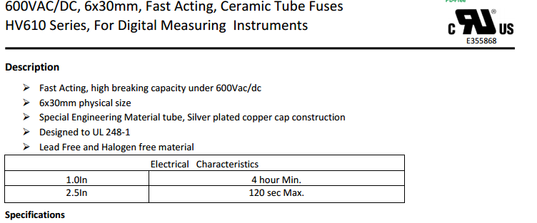 6x32mm, 600V直流, 出色的分斷特性為儀表誤操作提供了良好防護.